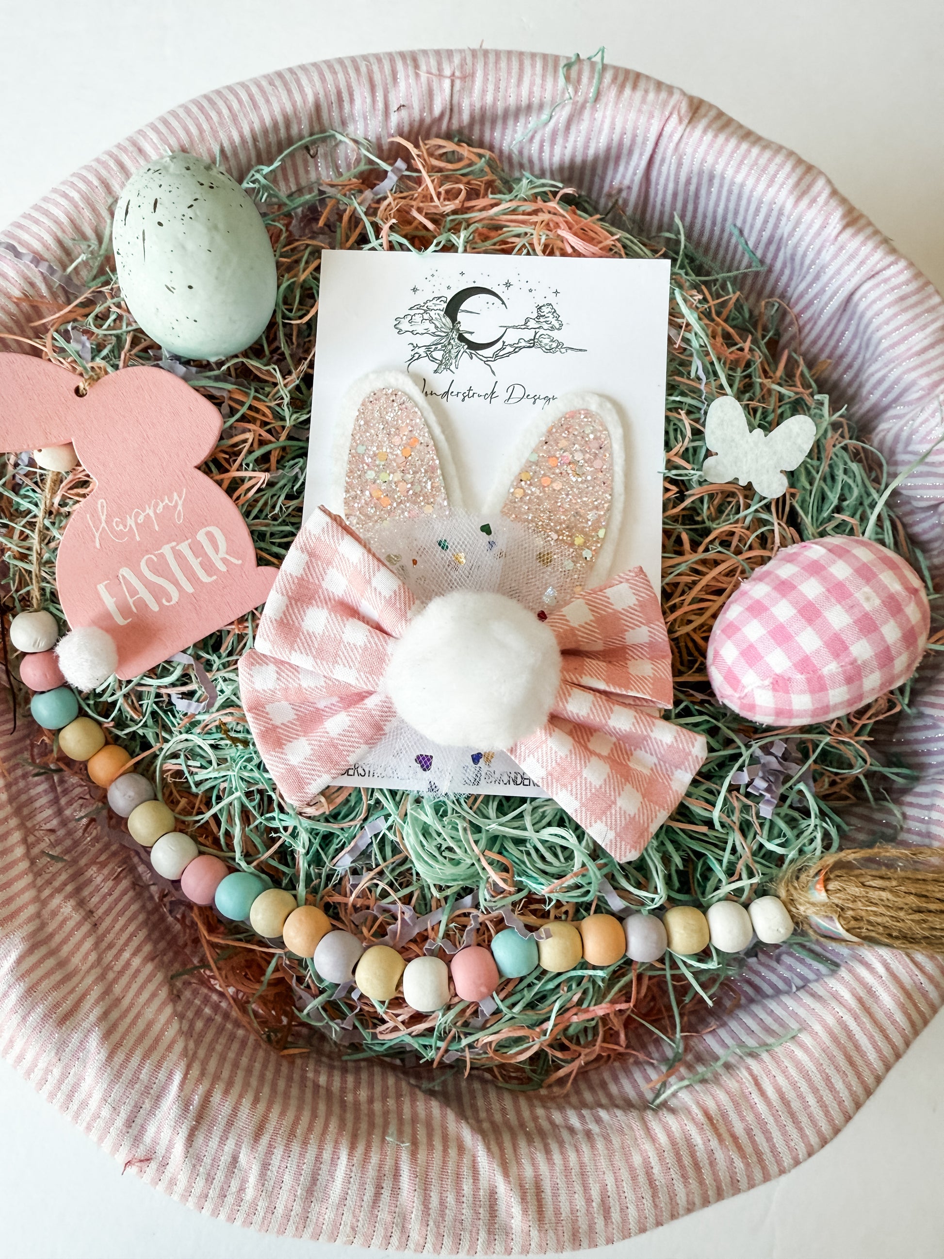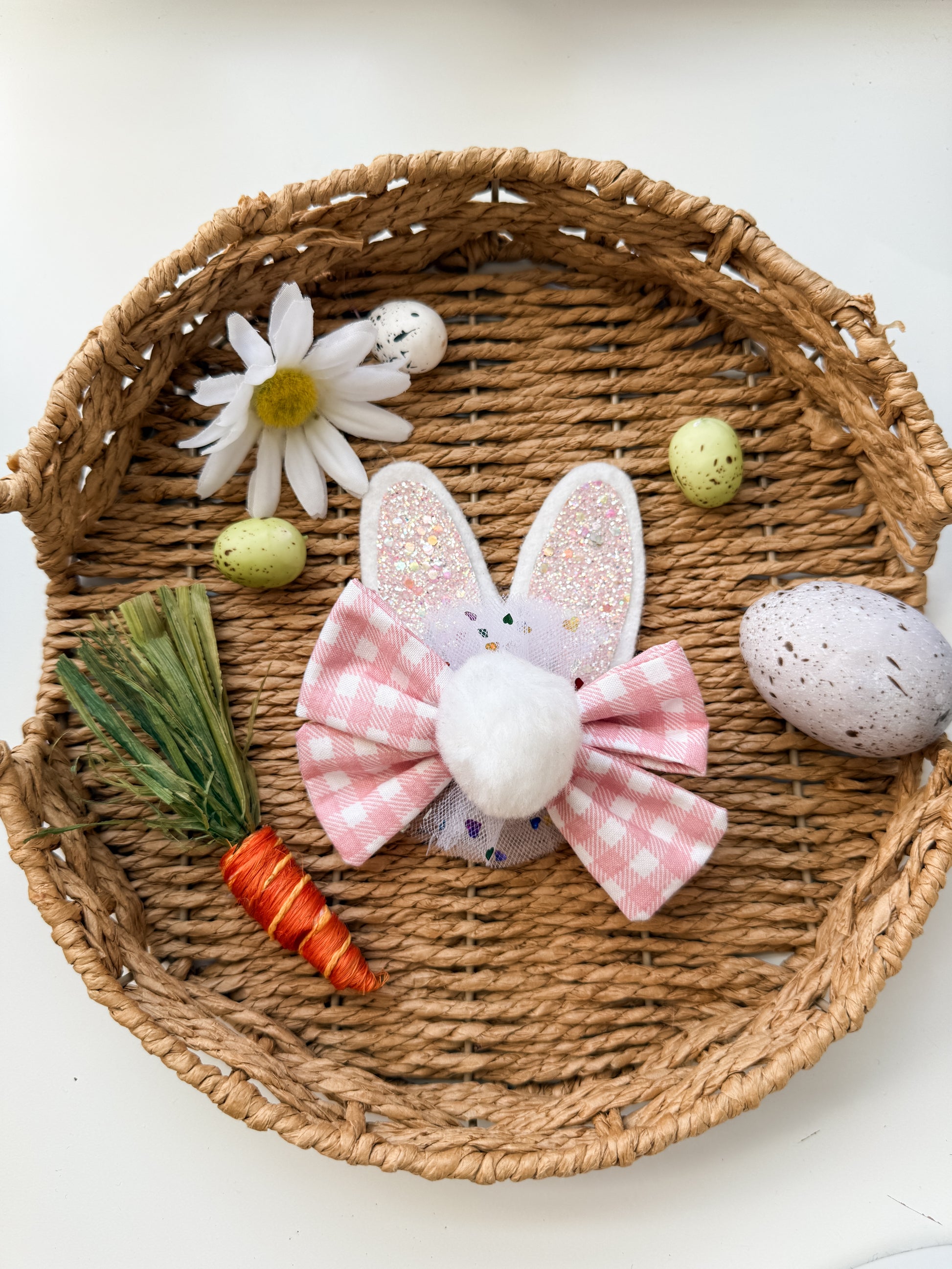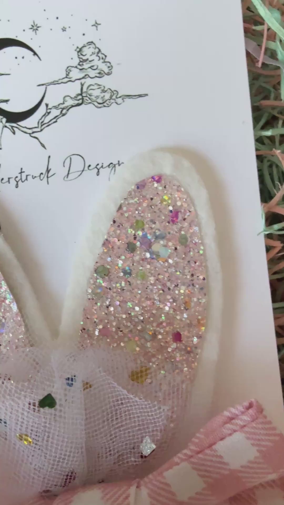 Hop to all the Easter festivities with these whimsical bunny ears! Crafted from luxurious wool, and glitter fabric for extra dazzle! With a fluffy bunny tail at the center and a soft pink gingham cotton fabric bow to bring it all together.