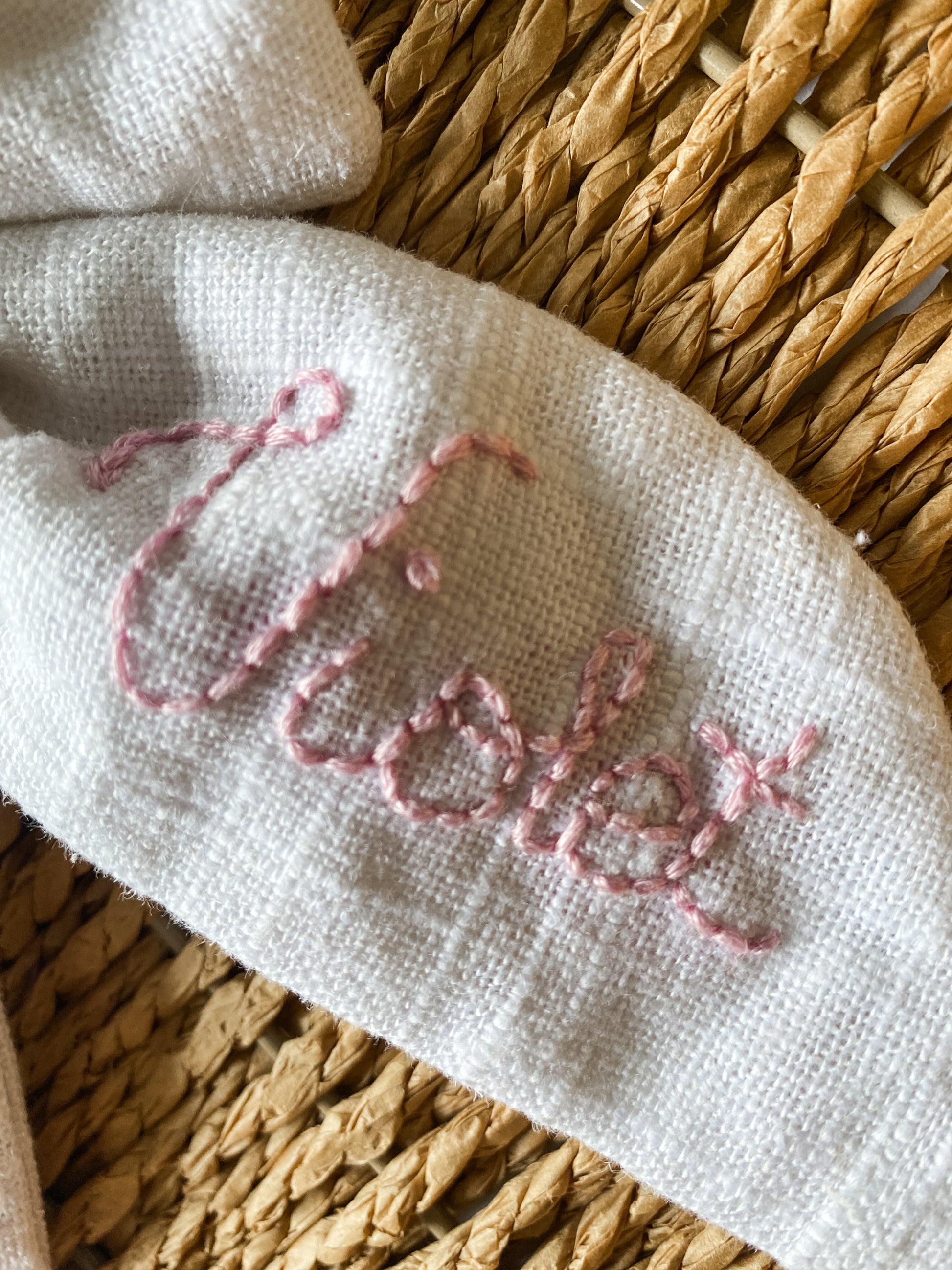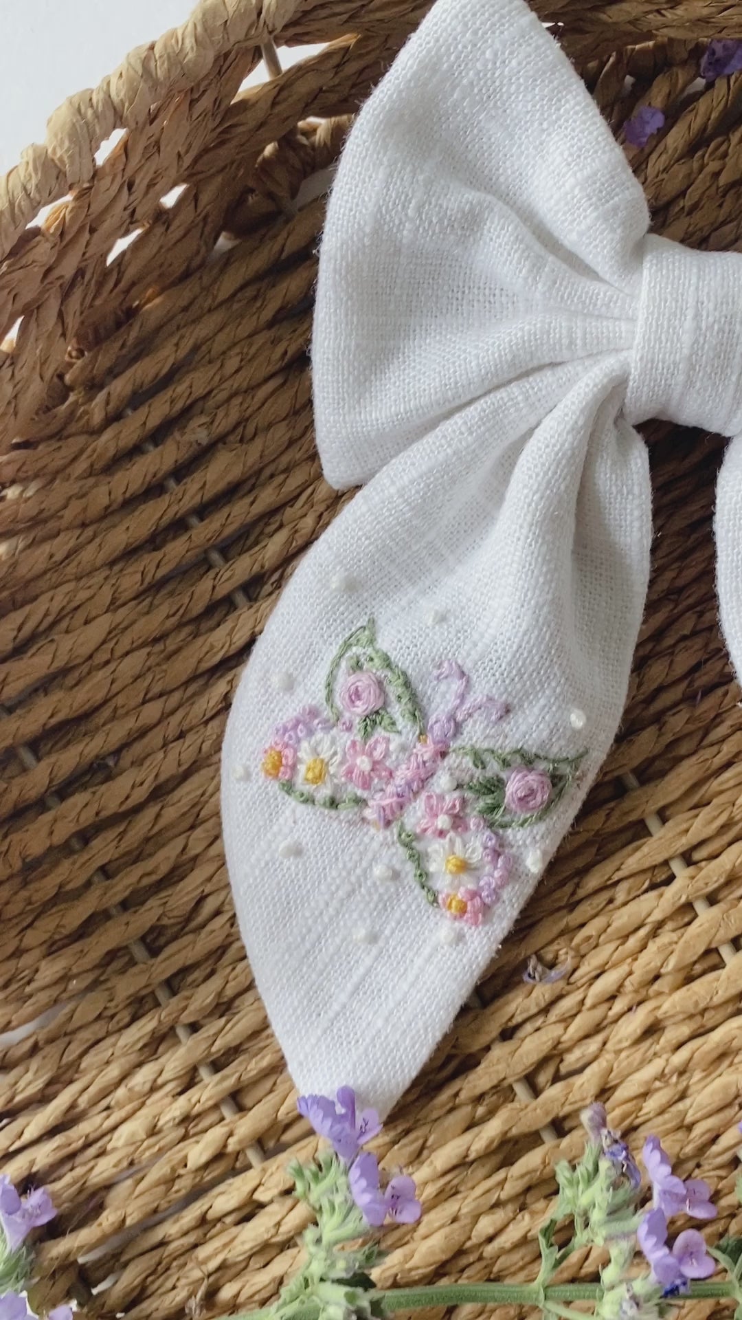 White linen Sailor bow with hand embroidered butterfly and name personalization.
