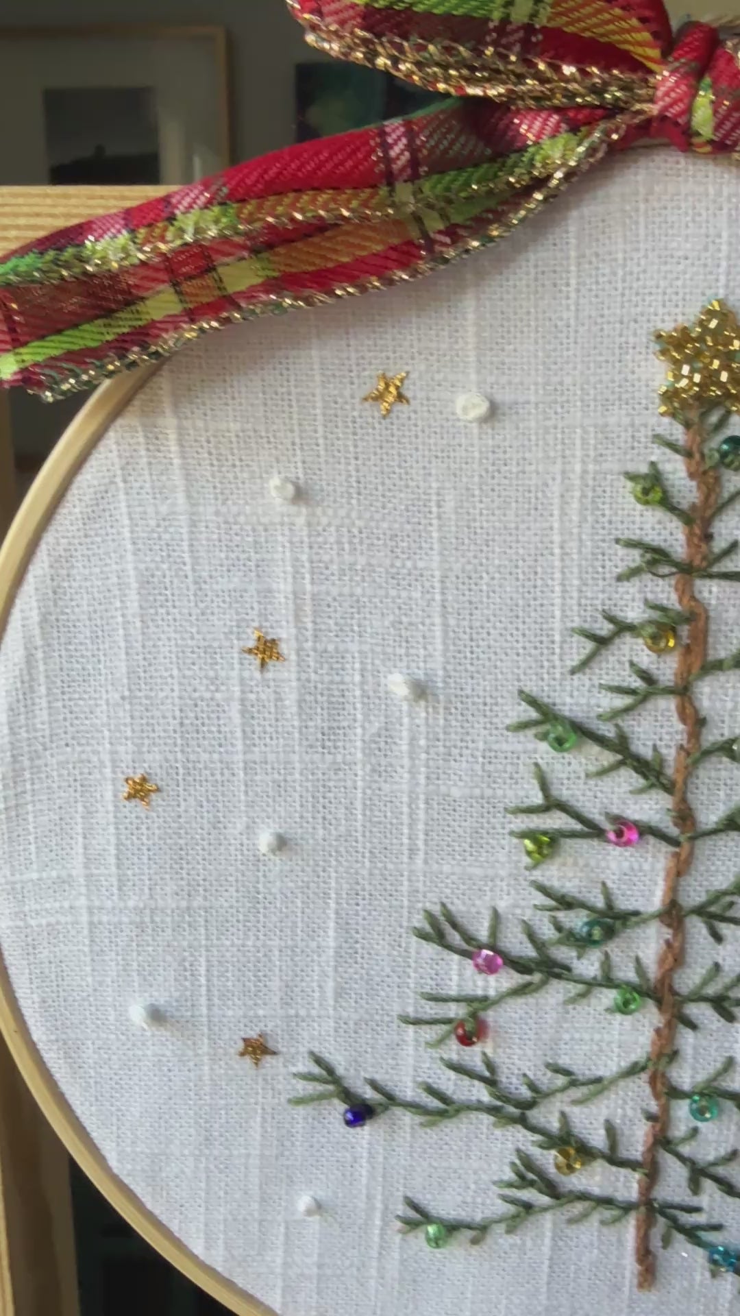 This Hand Embroidered Christmas wall art is comprised of white linen fabric, and a 8” bamboo hoop. Rainbow beading featured through out.
