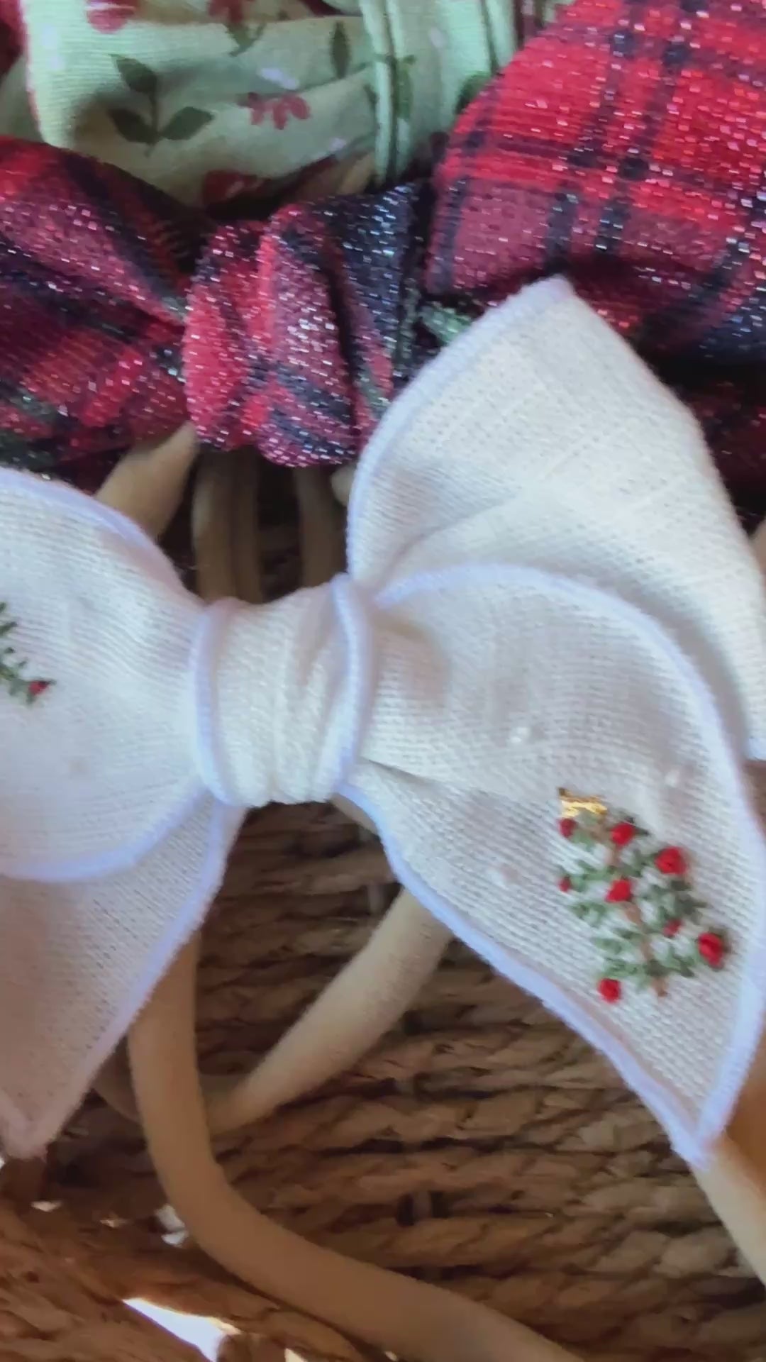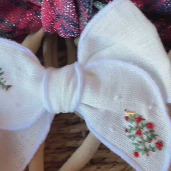 3.5” White linen baby bows on stretchy, nude nylon headbands. O/S Hand embroidered with holly and candy canes.