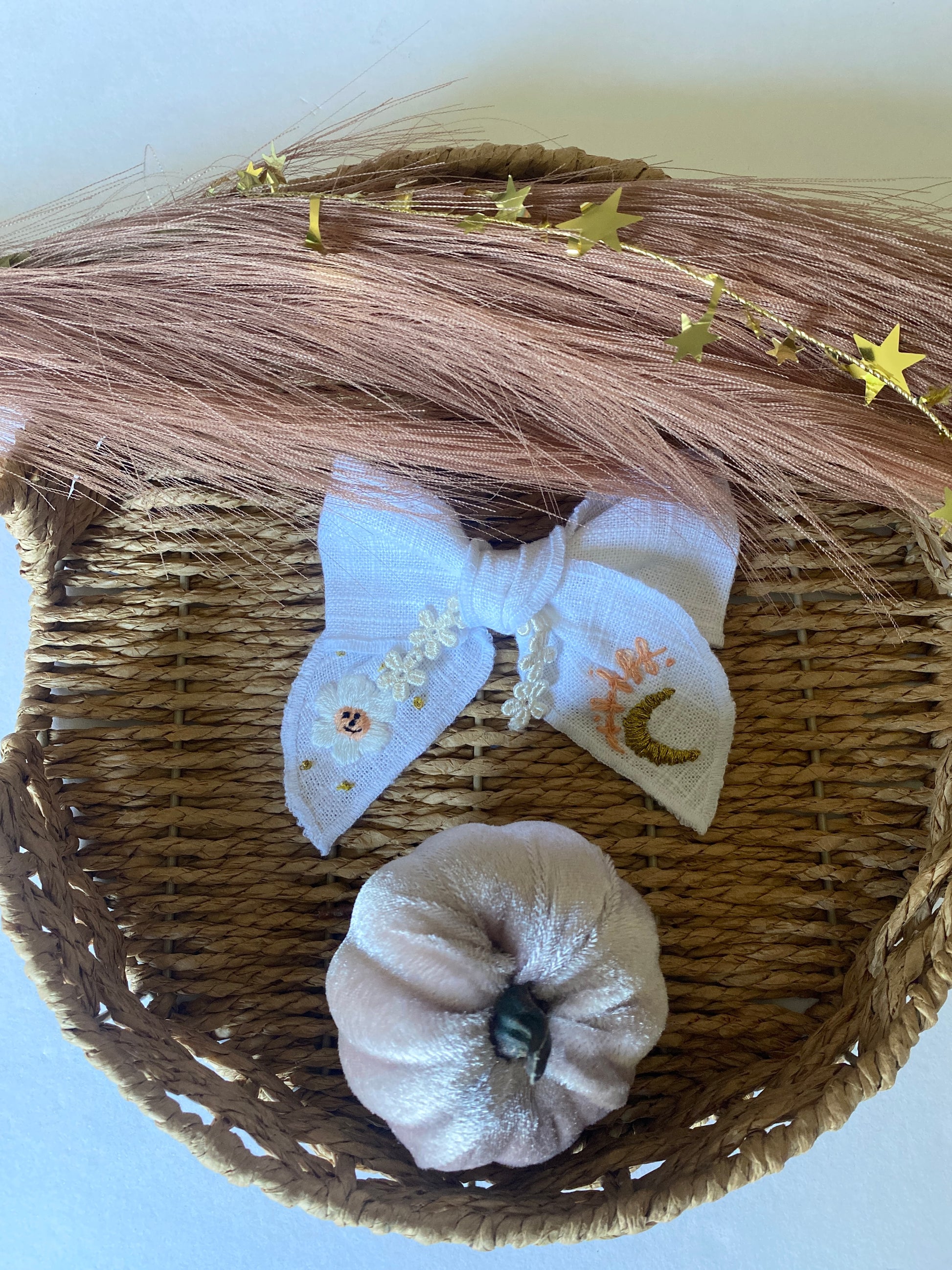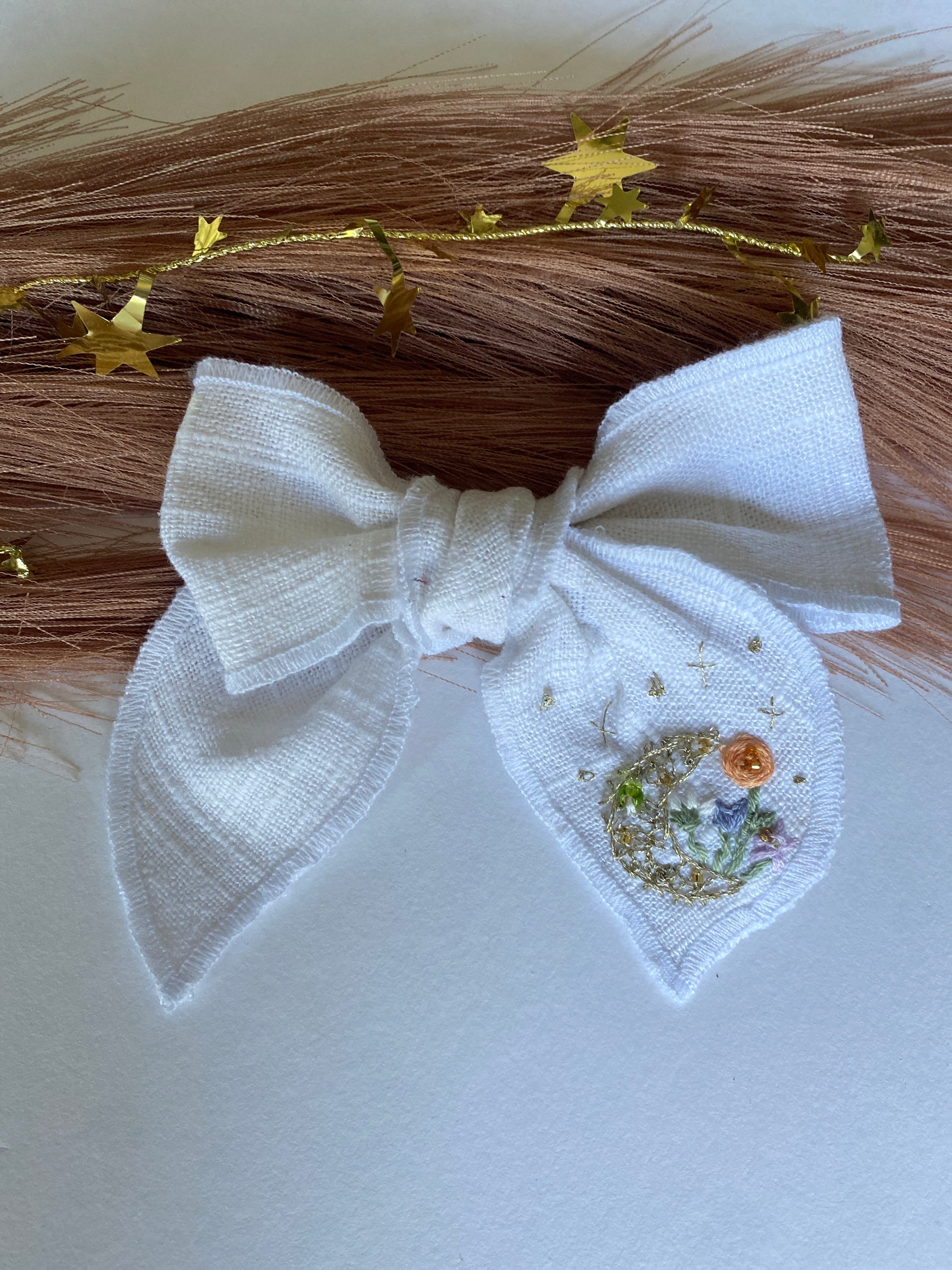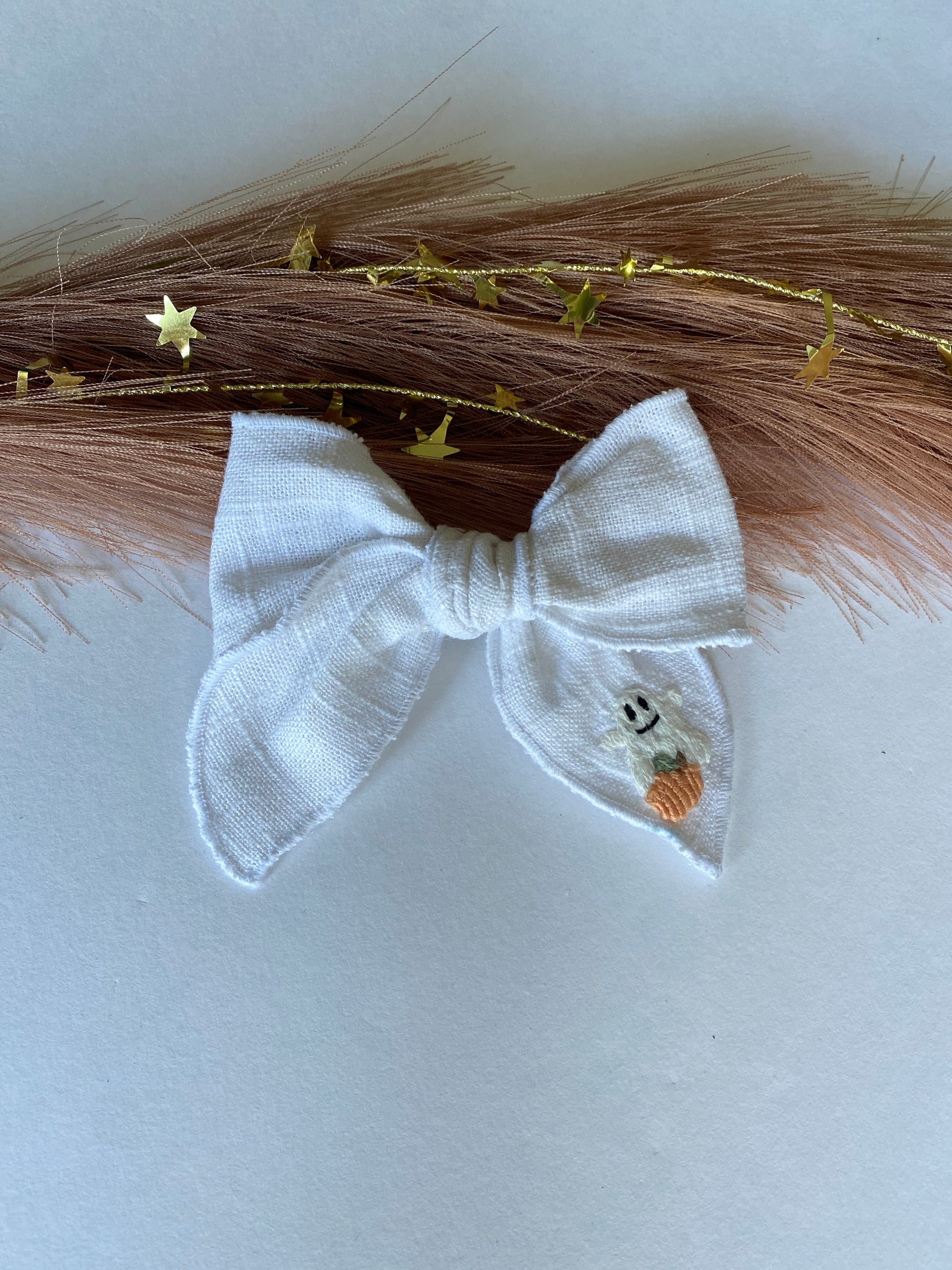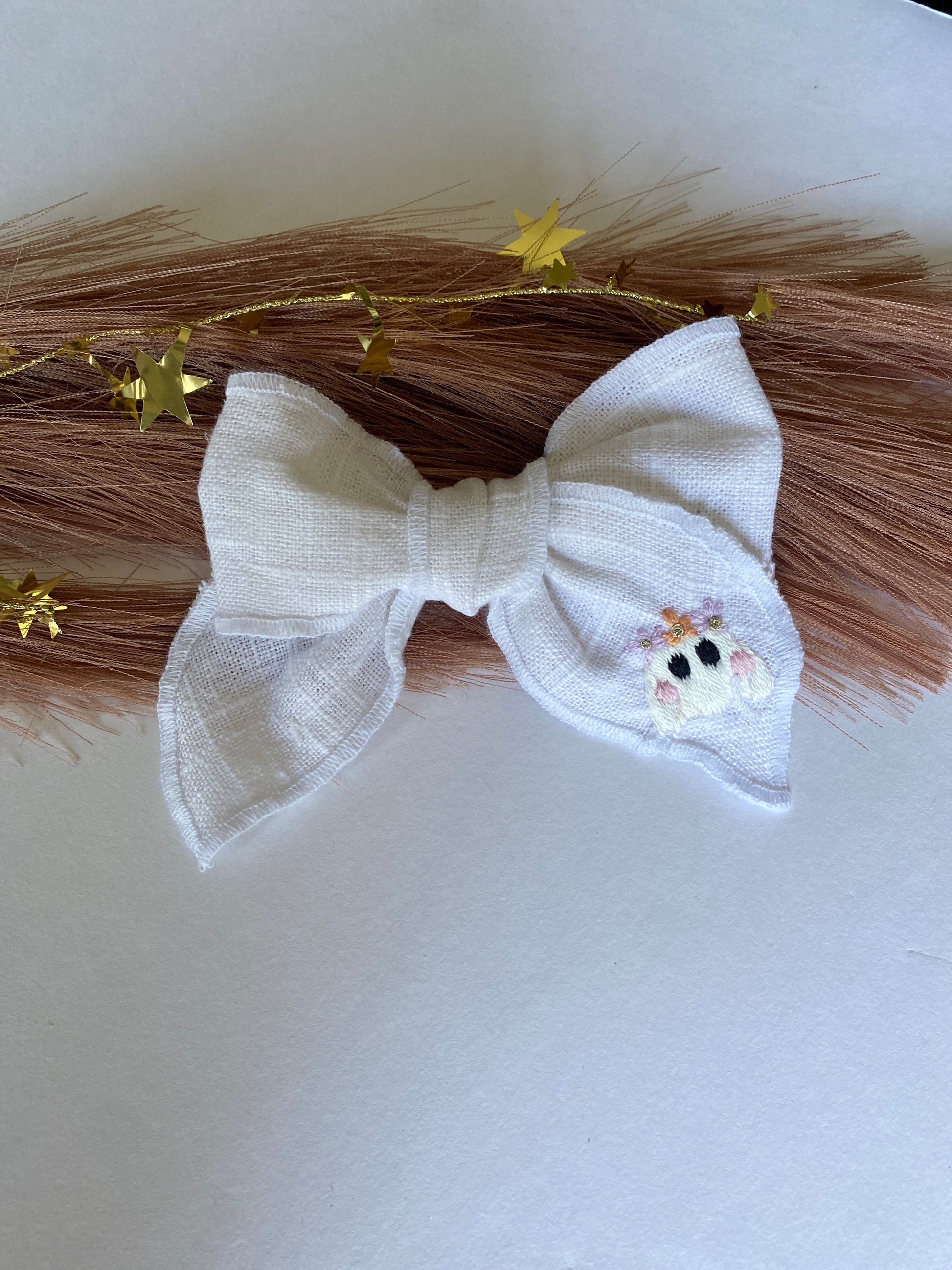 These white linen fabric bows are serged around the edges, and tied into the perfect knot bow. Bows sit on a 2” alligator clip; great for staying in hair all day.