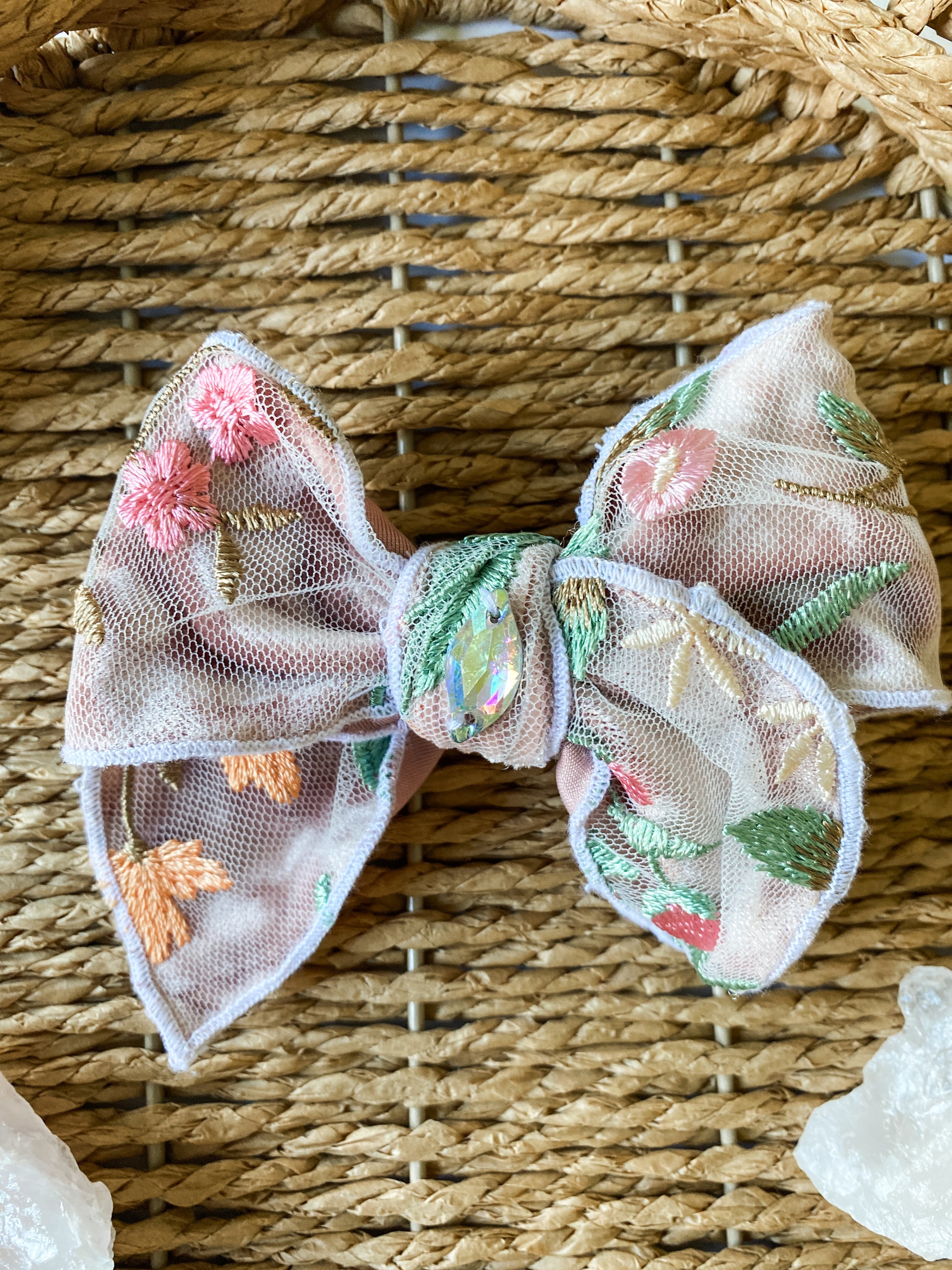 Velvet and tulle floral embroidered Bows inspired by Sleeping Beauty; a 4" serged bow on a 3”alligator clip.