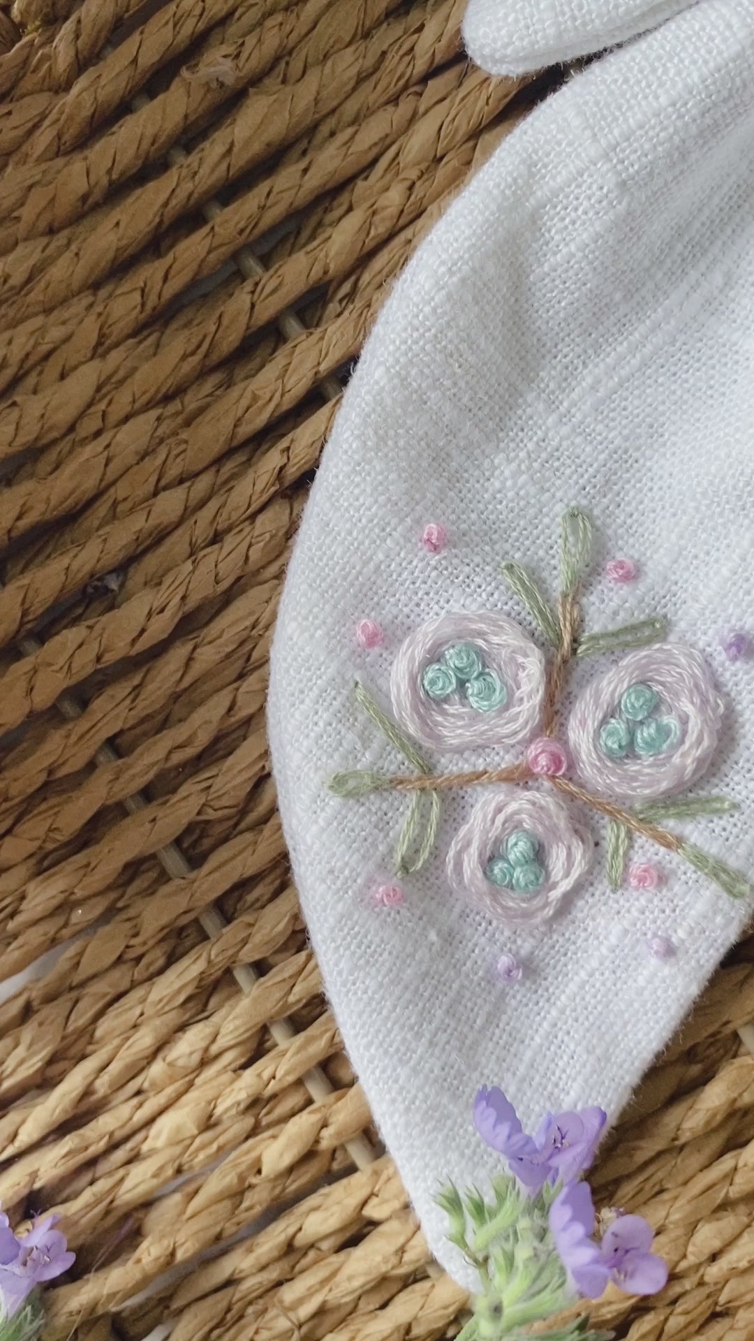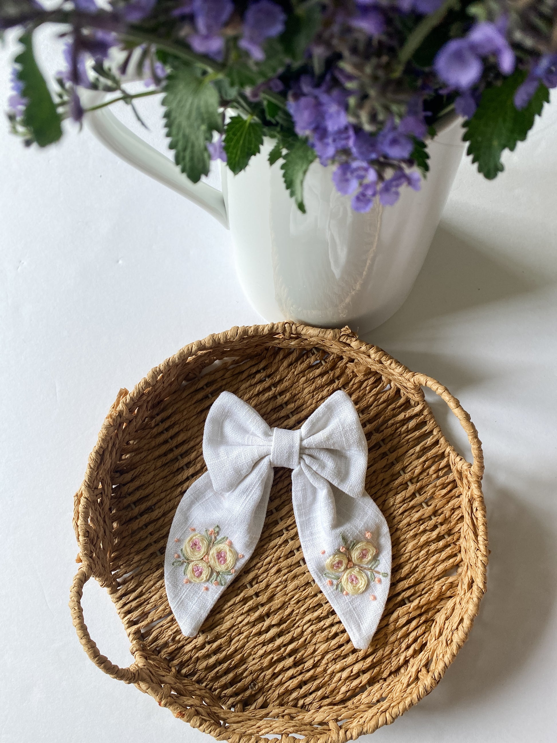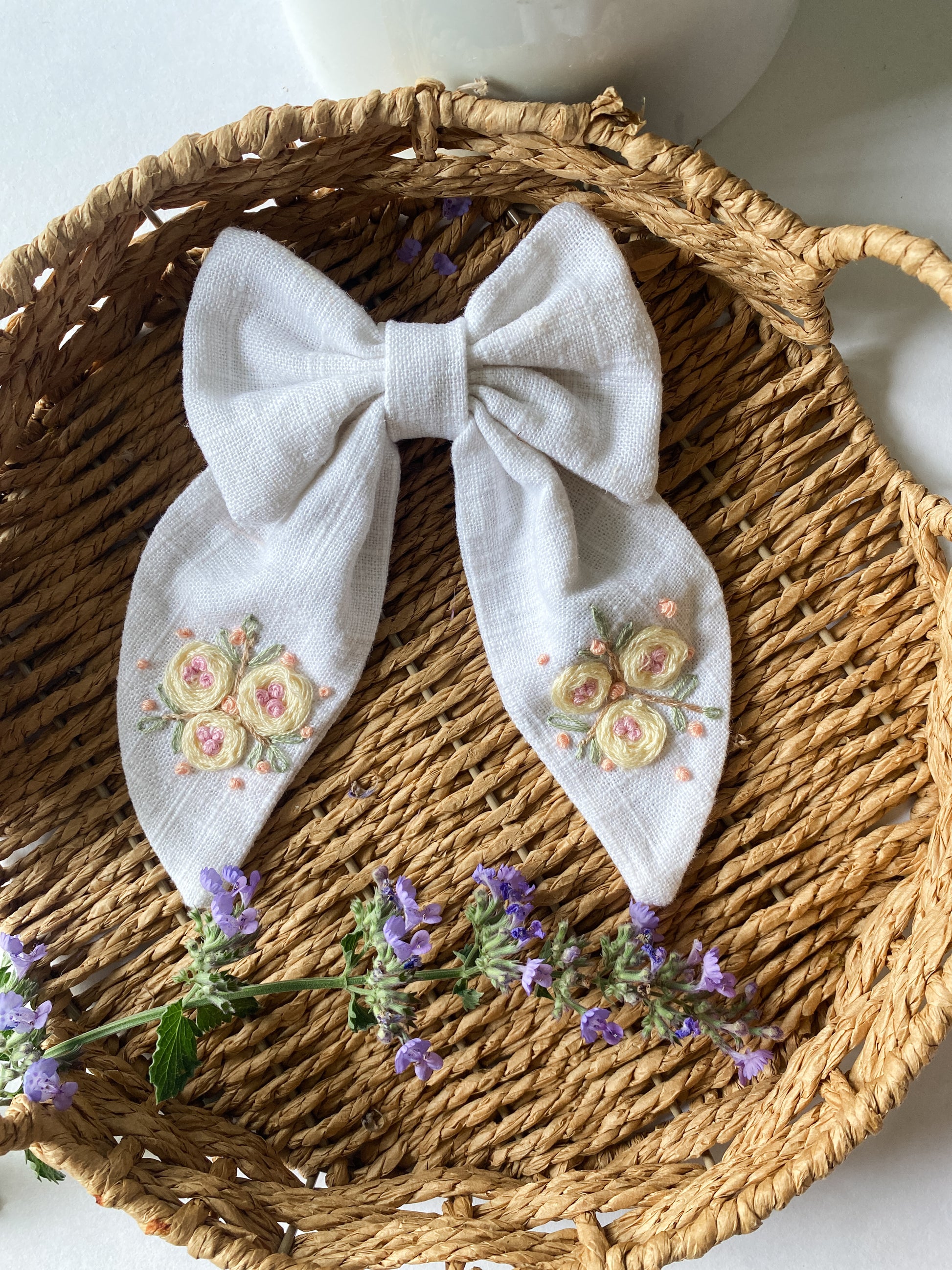 White linen, Sailor style bows; hand embroidered with Nest Egg design. Bows attach with 3” alligator clips.