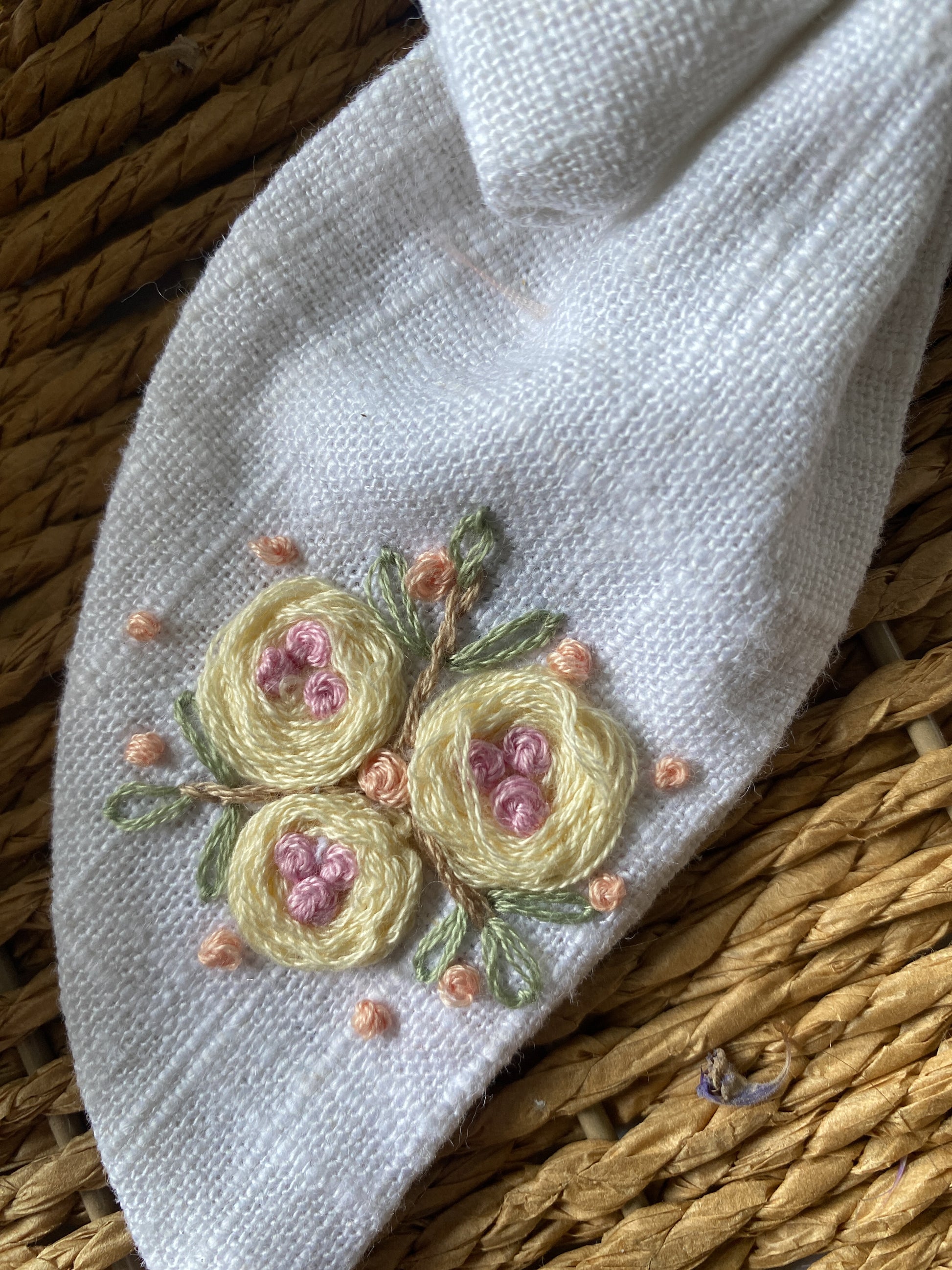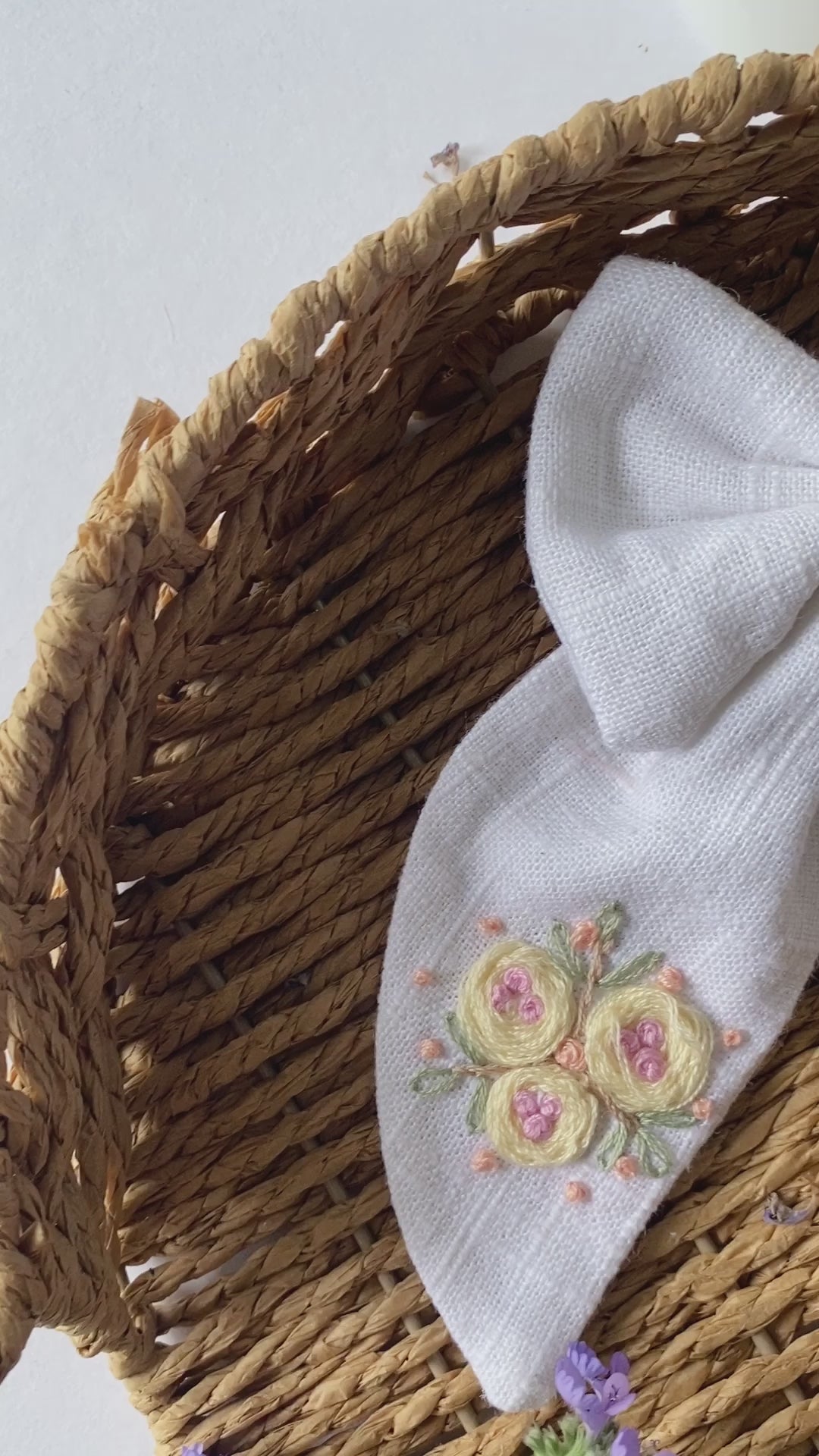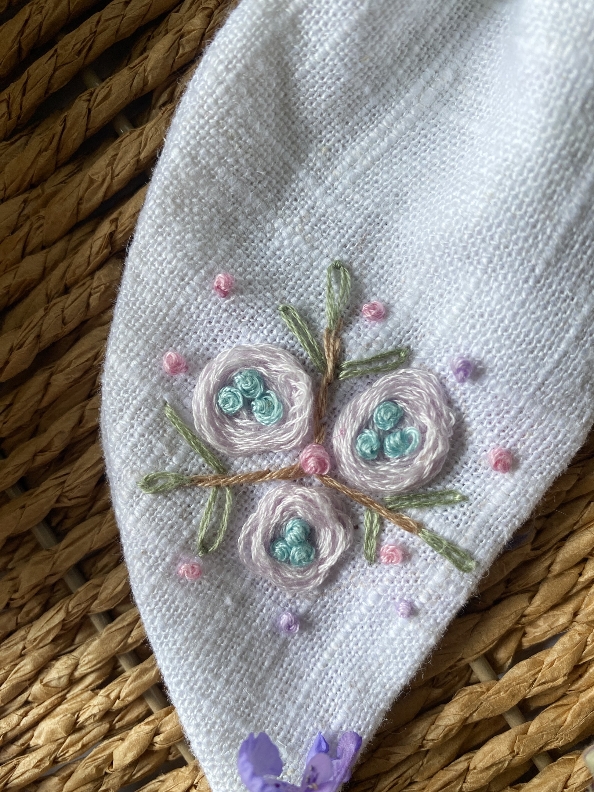 White linen, Sailor style bows; hand embroidered with Nest Egg design. Bows attach with 3” alligator clips.